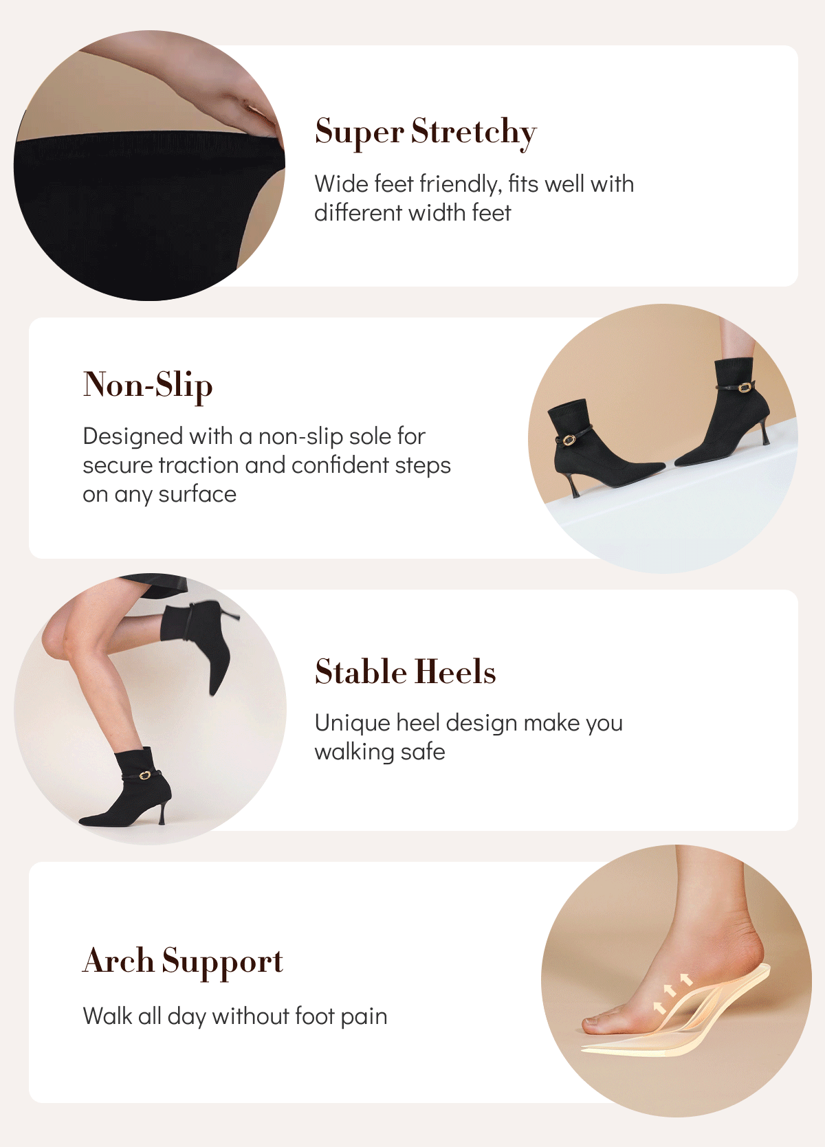 Absolutely! Our boots feature a stretchy flyknit fabric that provides excellent flexibility and a snug fit, accommodating various calf sizes. The tailored cut and design also help to enhance leg shape, creating a slimmer and more elongated look, making you feel confident and elegant.