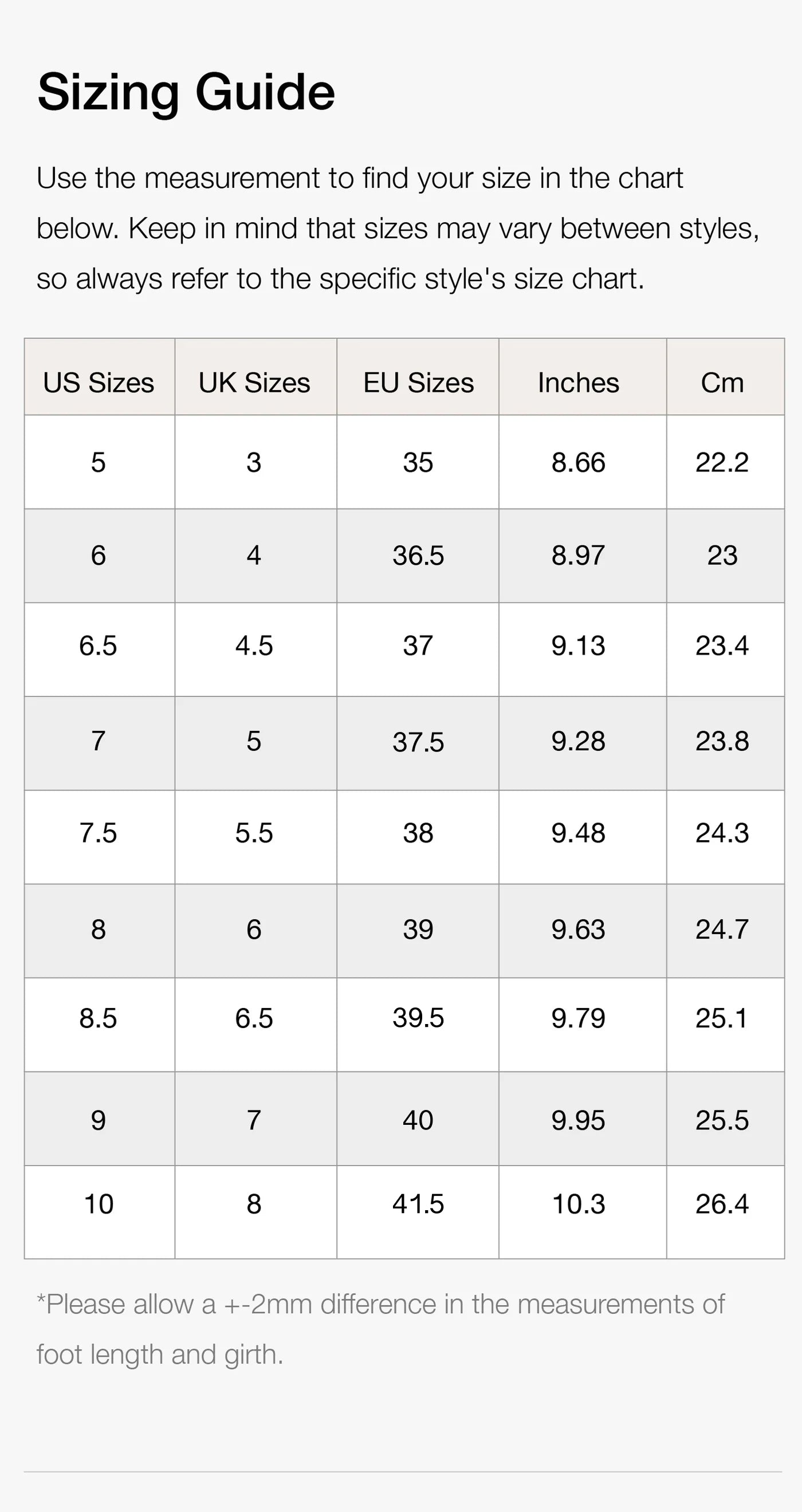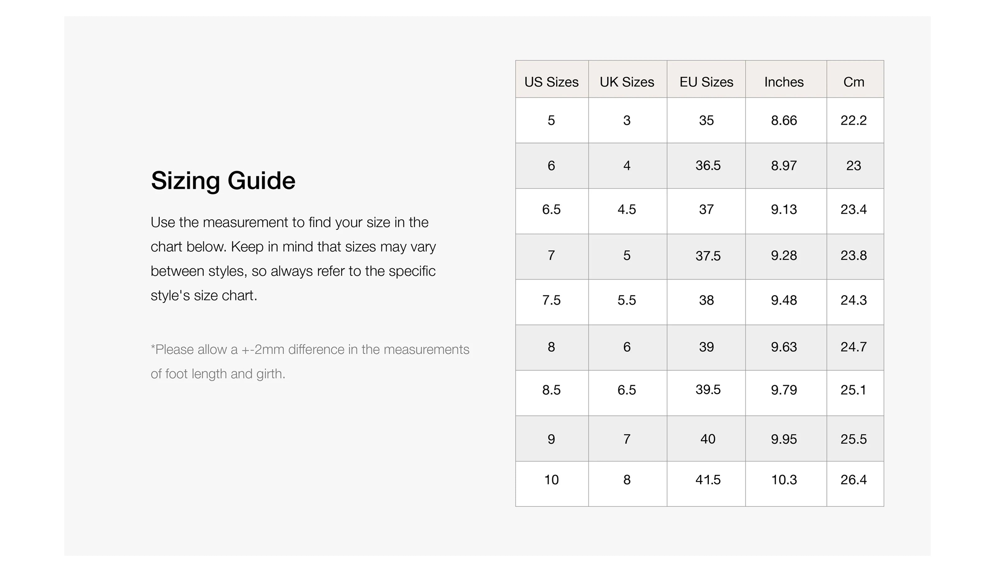 We know correctly fitting shoes are important which is why we offer whole and half sizes for a perfect fit! Wear your favourite footwear in the comfort and style that you would expect from COSY ISLAND by using our shoe fitting guide.