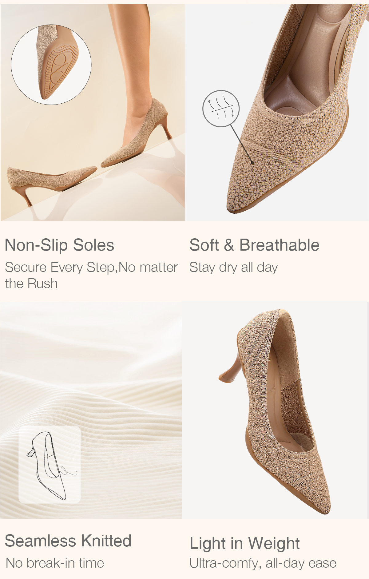 Estos zapatos de tacón de punta están diseñados para una sofisticación atemporal y comodidad para el día a día. Con un tacón de 7 cm (2,76 pulgadas), están confeccionados con materiales Fly Woven transpirables para un uso diario. La suela de goma antideslizante y el diseño amortiguador garantizan mayor comodidad y estabilidad, mientras que la plantilla acolchada con soporte para el arco del pie hace que cada paso sea un placer. Ideales para el trabajo, eventos o salidas informales.