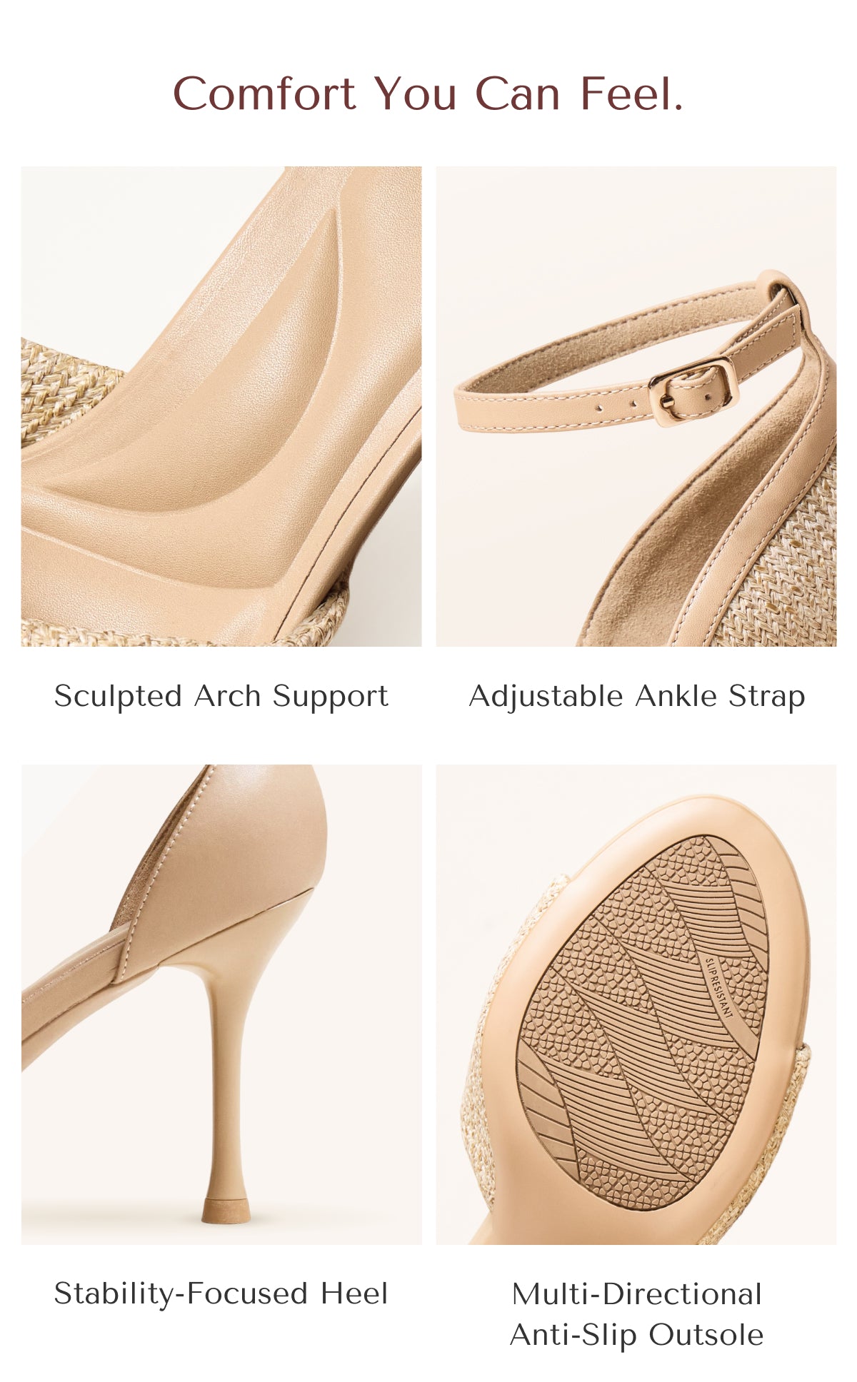 RaffiaGleam Ankle Strap Round Toe Heeled Sandal