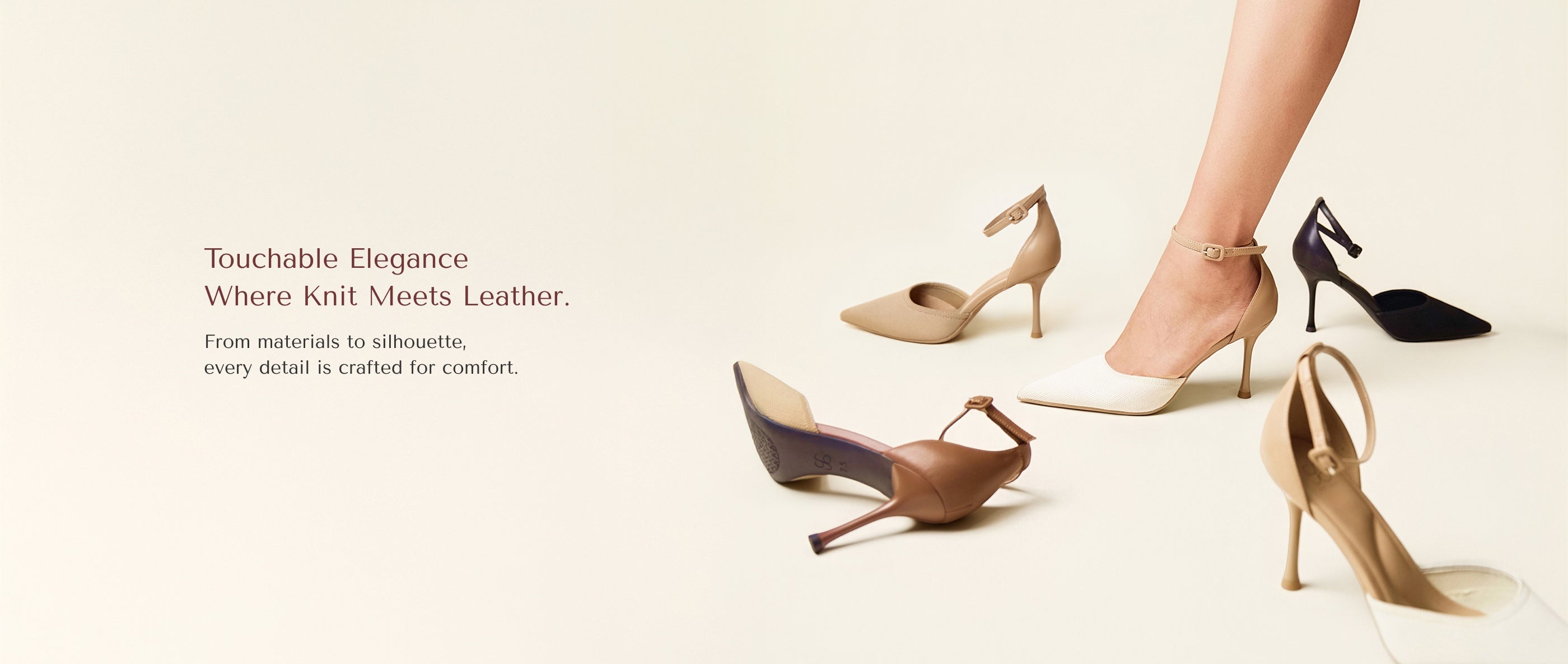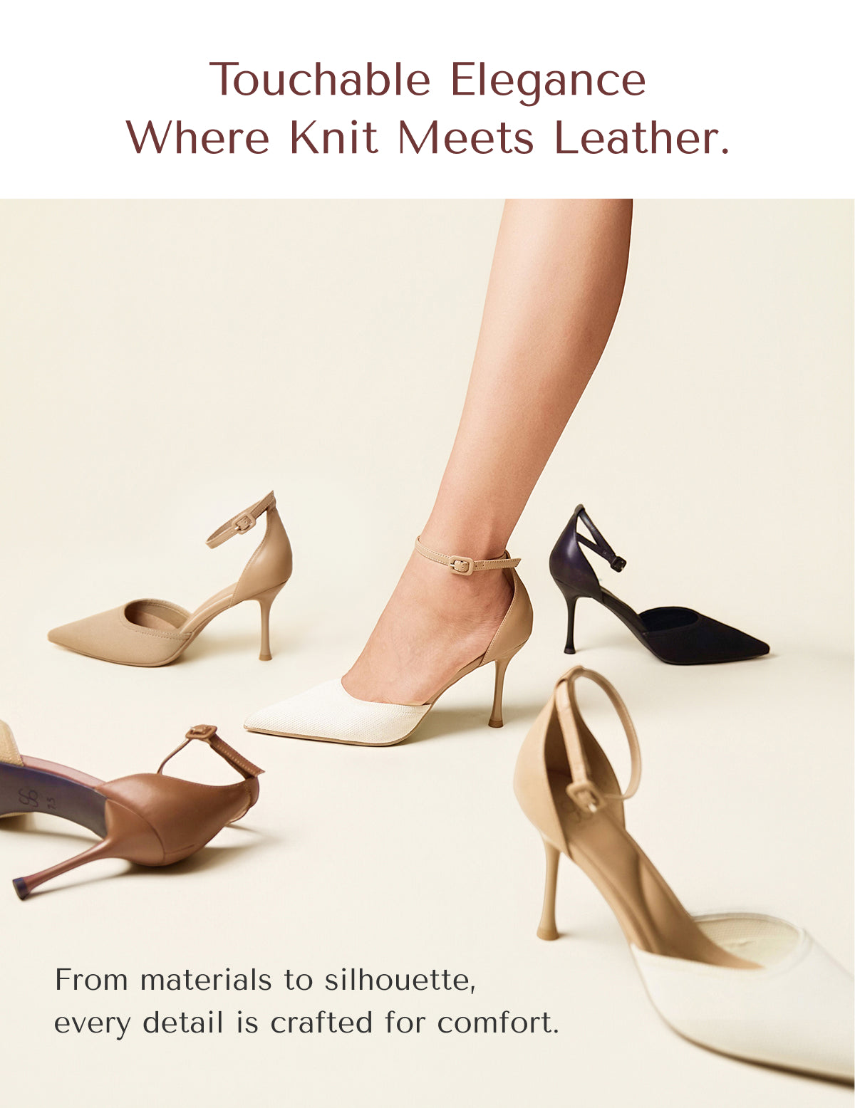 Crafted in a mix of fly-woven and PU, these pointed-toe pumps feature a dynamic two-tone design that wraps around the ankle with a refined pin-buckle strap. The color contrast creates visual elongation for the legs, while the breathable texture ensures lasting comfort.
