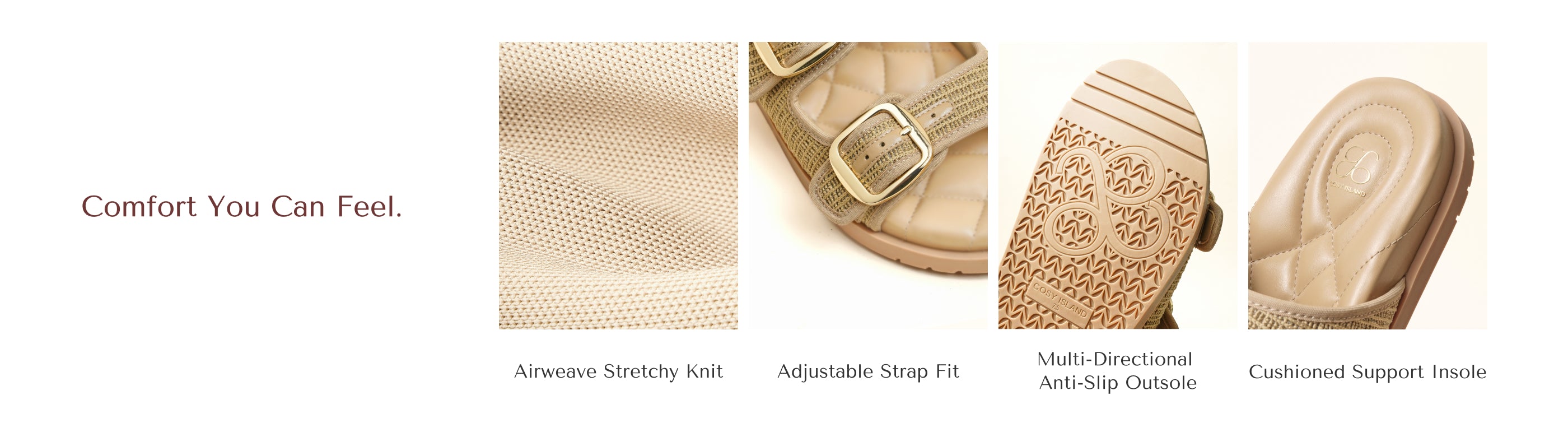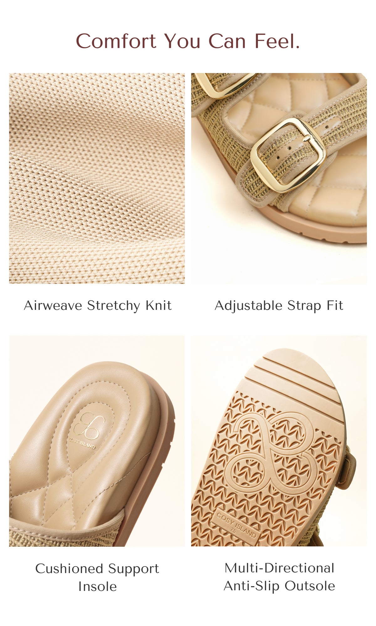 The comfort of your favorite footbed sandal meets everyday elegance. The CloudStep Slide swaps the usual clunky look for a sophisticated woven upper and polished gold buckles. True to its name, slipping into these feels like walking on a cloud: the adjustable straps are fully lined with plush velvet to prevent blisters, while the luxuriously quilted, 3.0cm (1.18 inches) shock-absorbing sole protects your joints from hard impacts. Effortlessly slide them on with wide-leg linen trousers or a breezy sundress for an instantly polished, pain-free summer look.