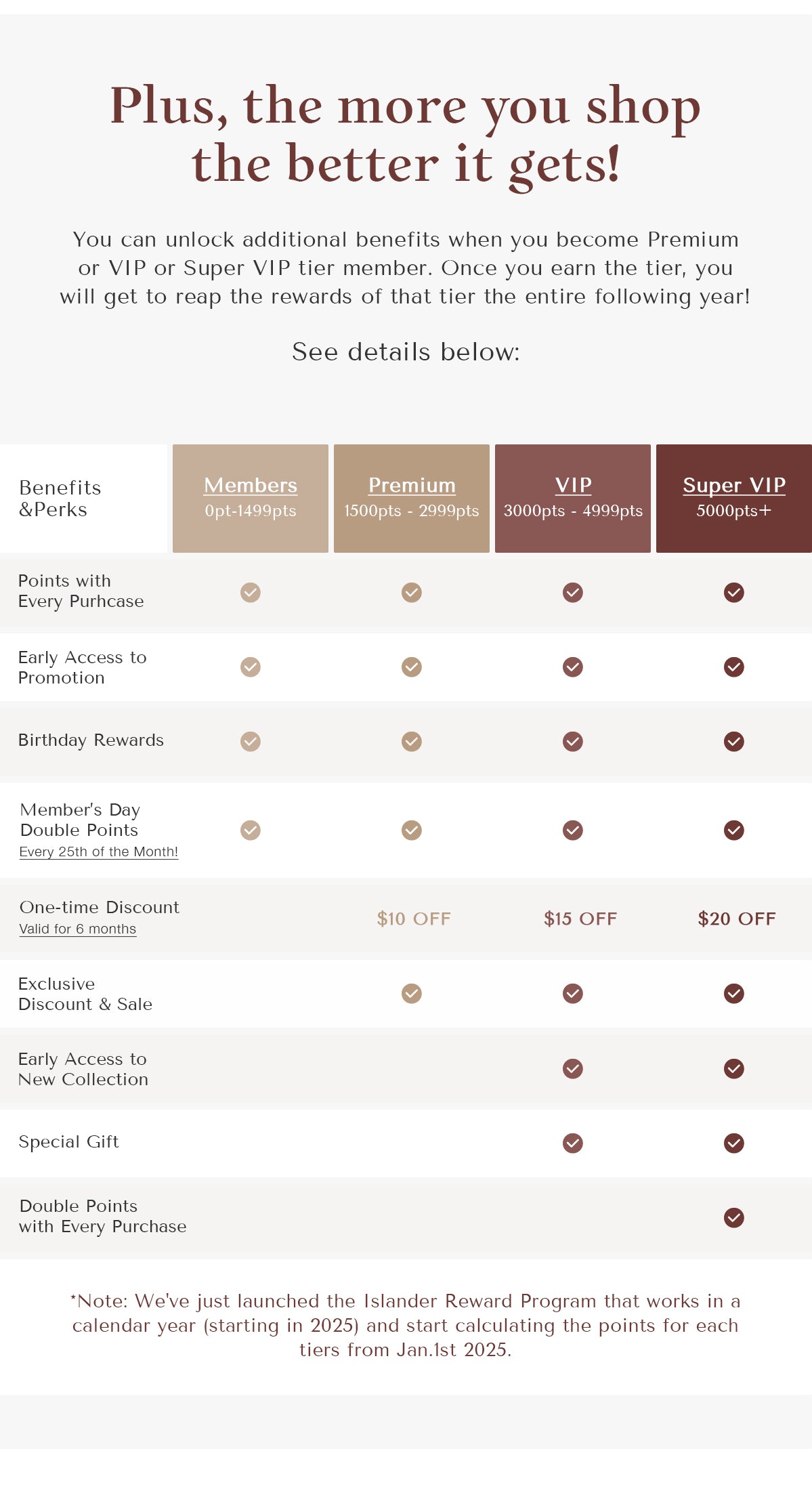 Since we launched the Islander Rewards Program this year, all membership tiers have been calculated based on the points accumulated since January 1st 2025. Although the points you earned last year do not count toward your current tier, you can still use those points to redeem discounts and rewards!