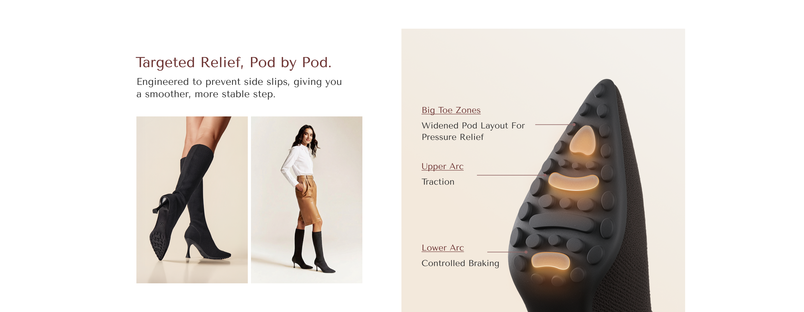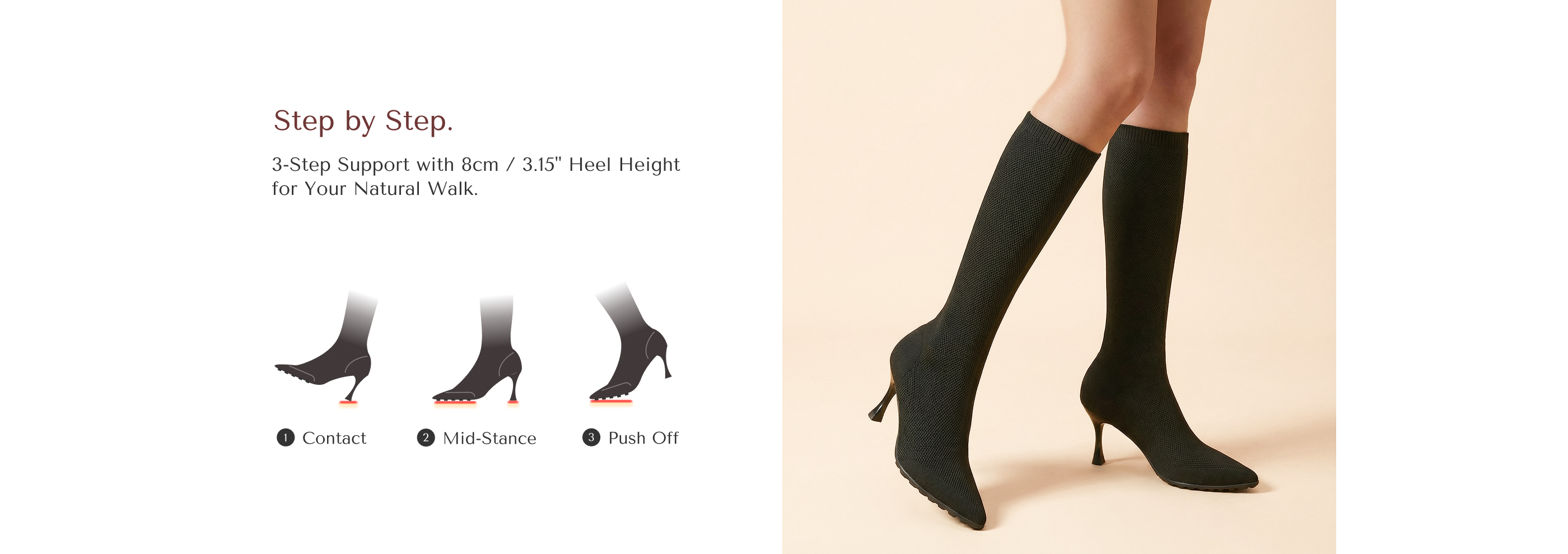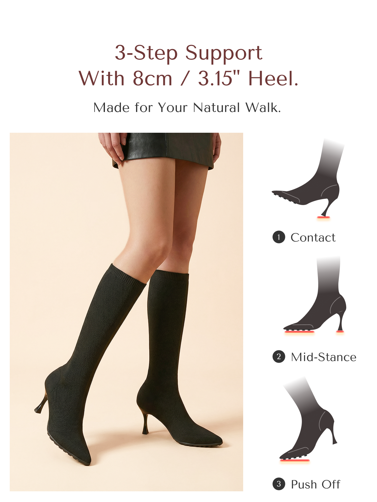 All grip, all grace. The SoftBounce Boots combine sleek design with a functional pebble-pattern outsole for superior traction. Crafted from breathable fly-woven fabric with 6% wool blend, they keep you cozy yet lightweight. A pointed toe and sculpted stiletto heel bring effortless sophistication, while the anti-slip sole ensures confident steps from day to night.