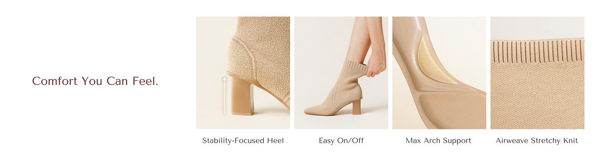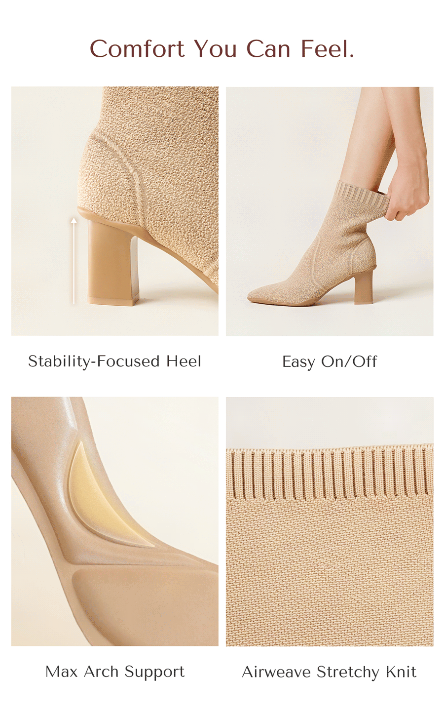 Step into sleek versatility with BelleVoyage Block Ankle Boots. These 6cm (2.36 inches) block heel sock boots are crafted from tech-knit Fly Woven with water-repellent treatment, offering a snug fit, effortless slip-on wear, and weather-ready durability. The pointed toe elongates your silhouette while the mid-height shaft (7.09 inches) delivers a polished, modern edge. Perfect for pairing with everything from cropped trousers to midi skirts.
