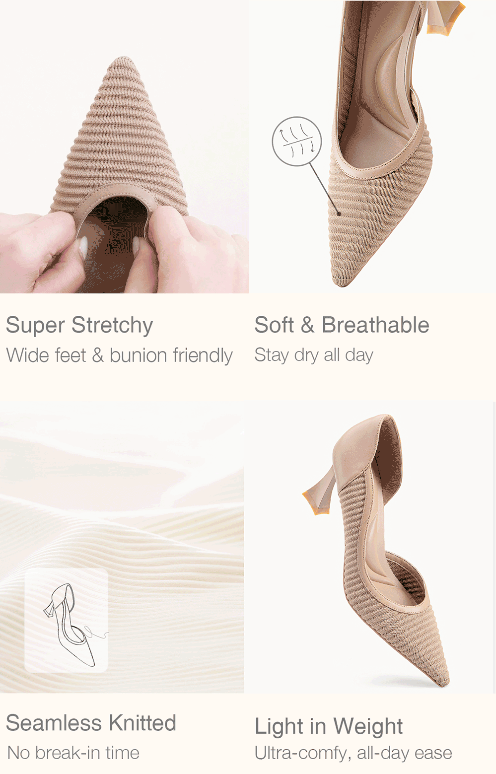 These elegant pumps are expertly crafted from a blend of Fly Woven and PU materials, offering both breathability and durability. Designed with a 7.5cm (2.95 inches) stiletto heel and a sleek pointed toe, they bring a sophisticated edge to any outfit. The cushioned insole and built-in arch support ensure all-day comfort. Ideal for professional settings, social occasions, or the daily commute, these pumps are the perfect blend of style and functionality.