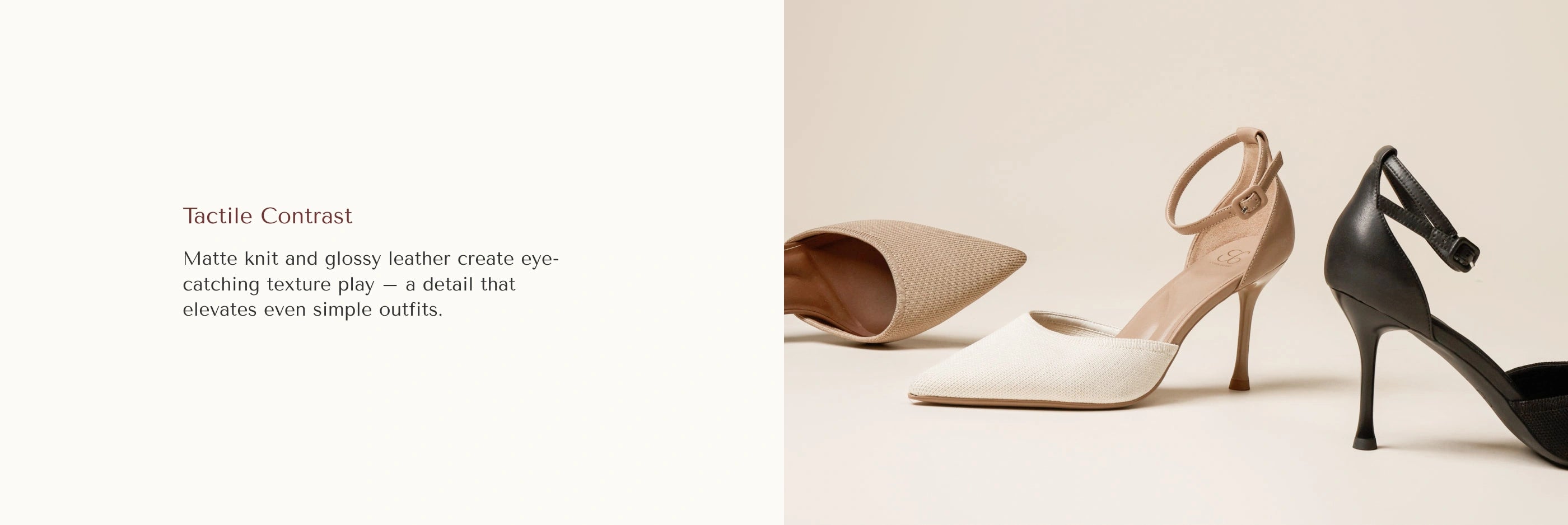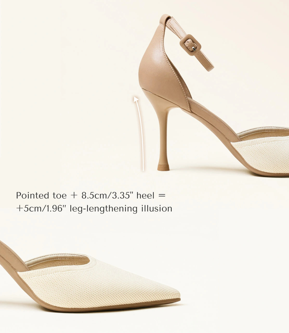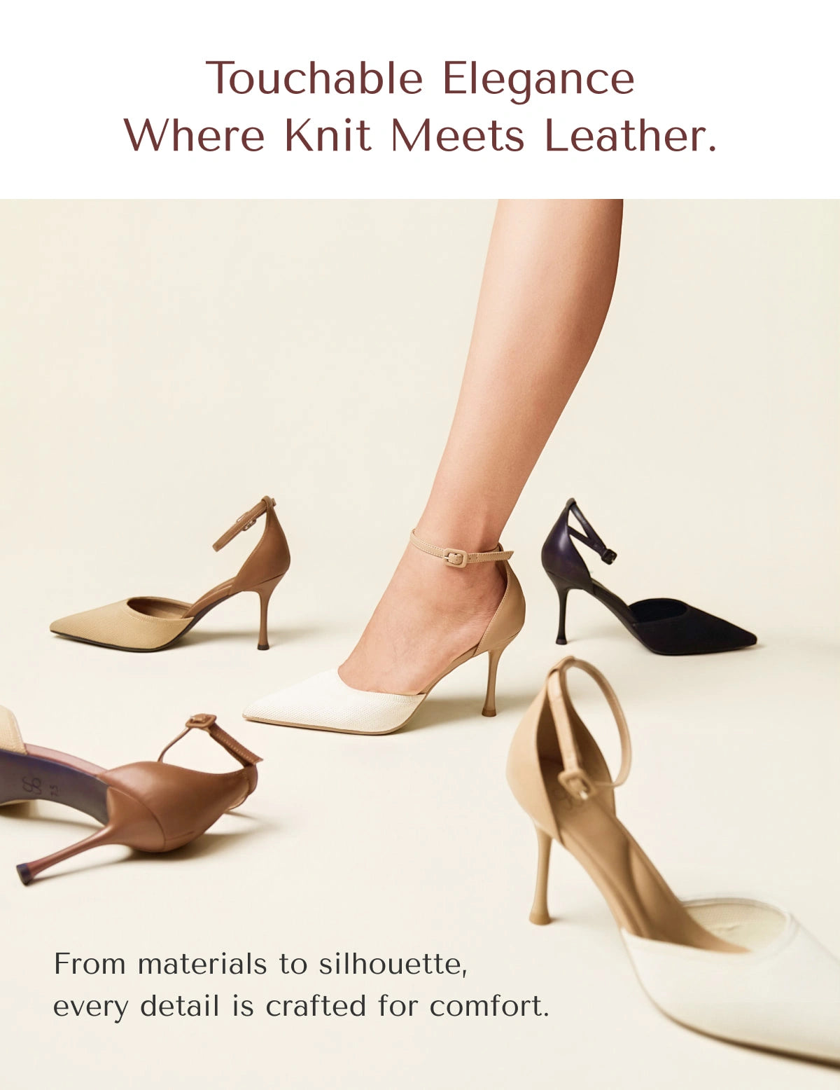 Crafted in a mix of fly-woven and PU, these pointed-toe pumps feature a dynamic two-tone design that wraps around the ankle with a refined pin-buckle strap. The color contrast creates visual elongation for the legs, while the breathable texture ensures lasting comfort.