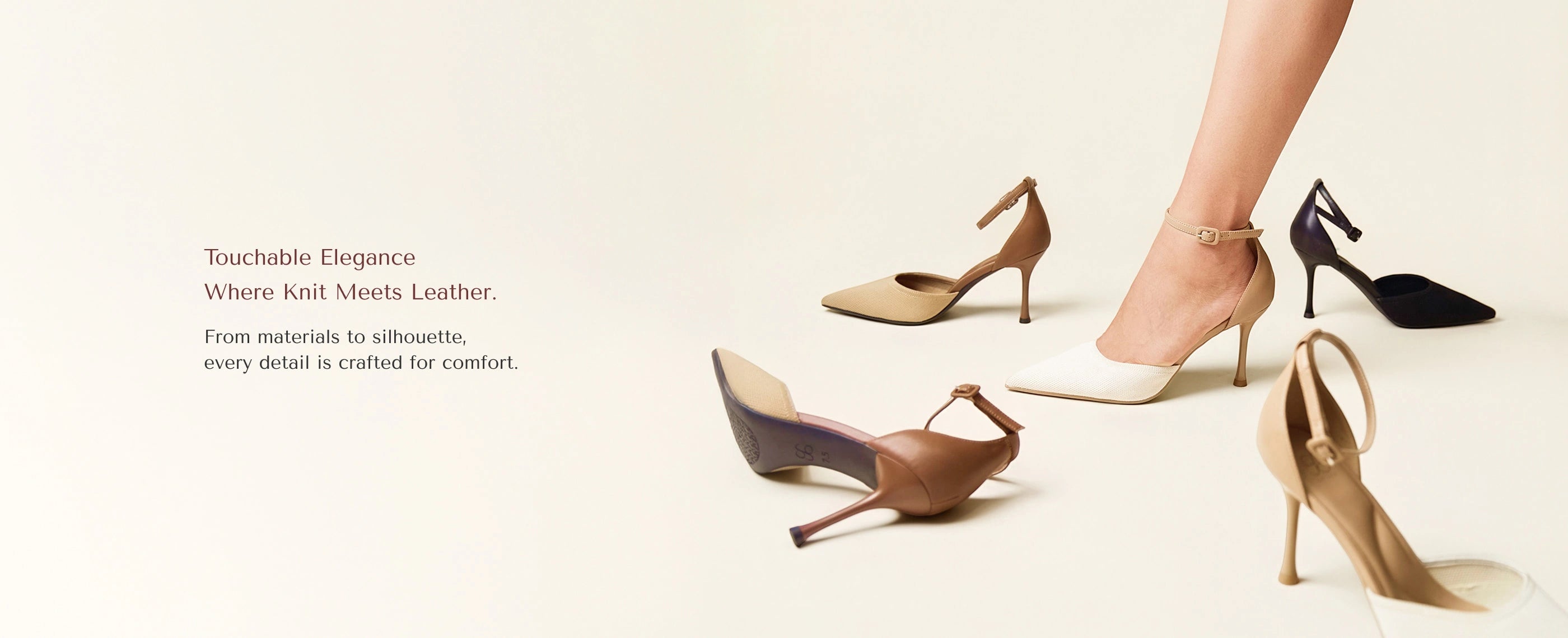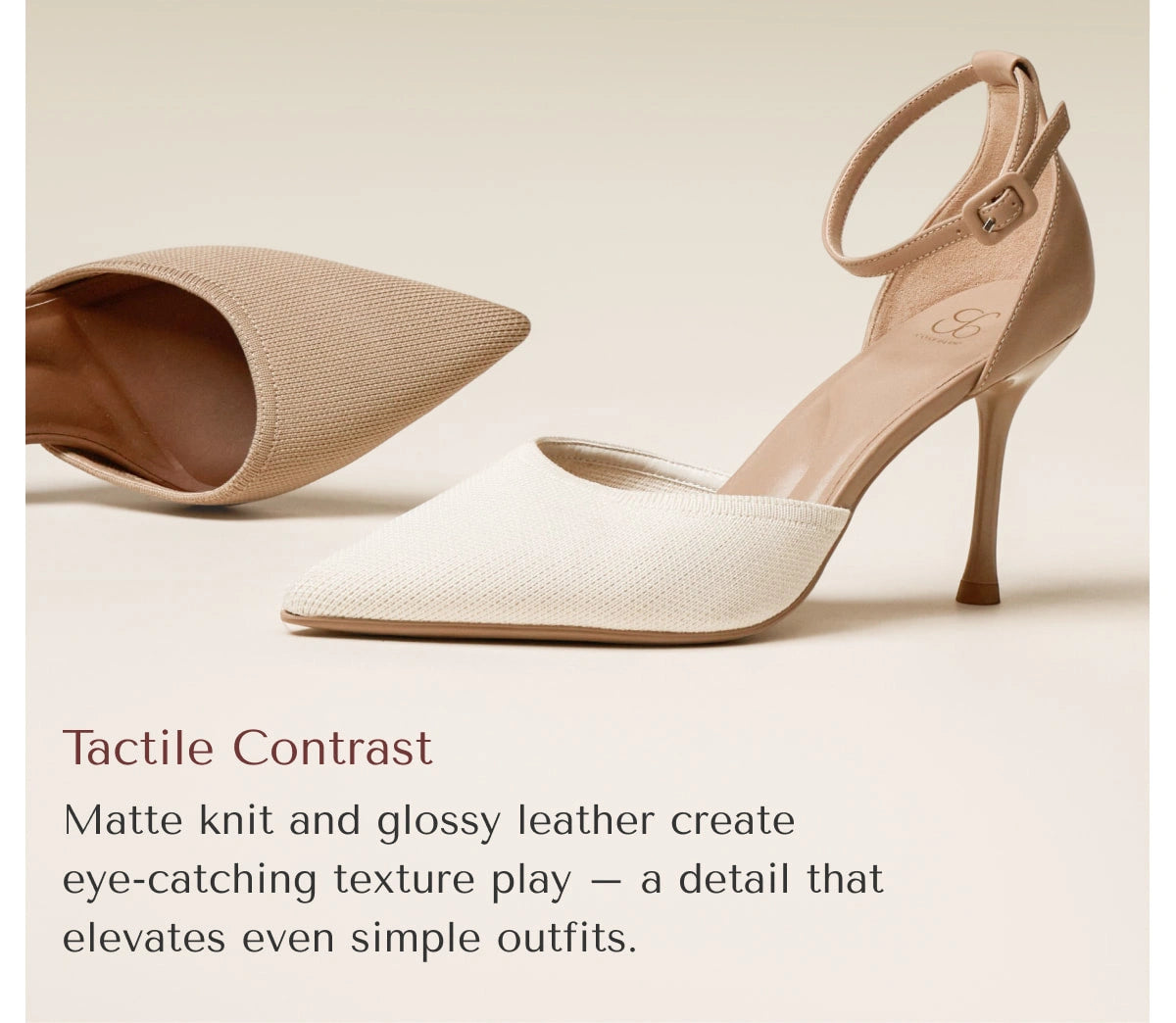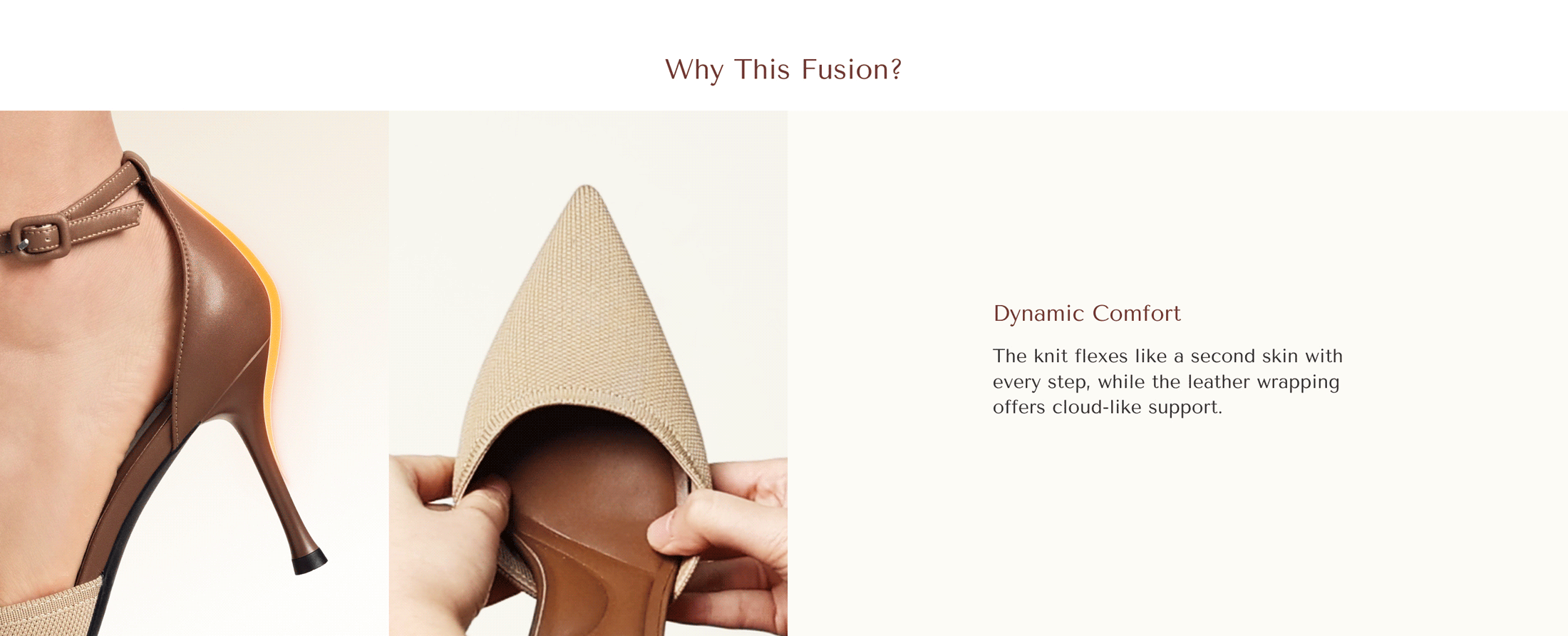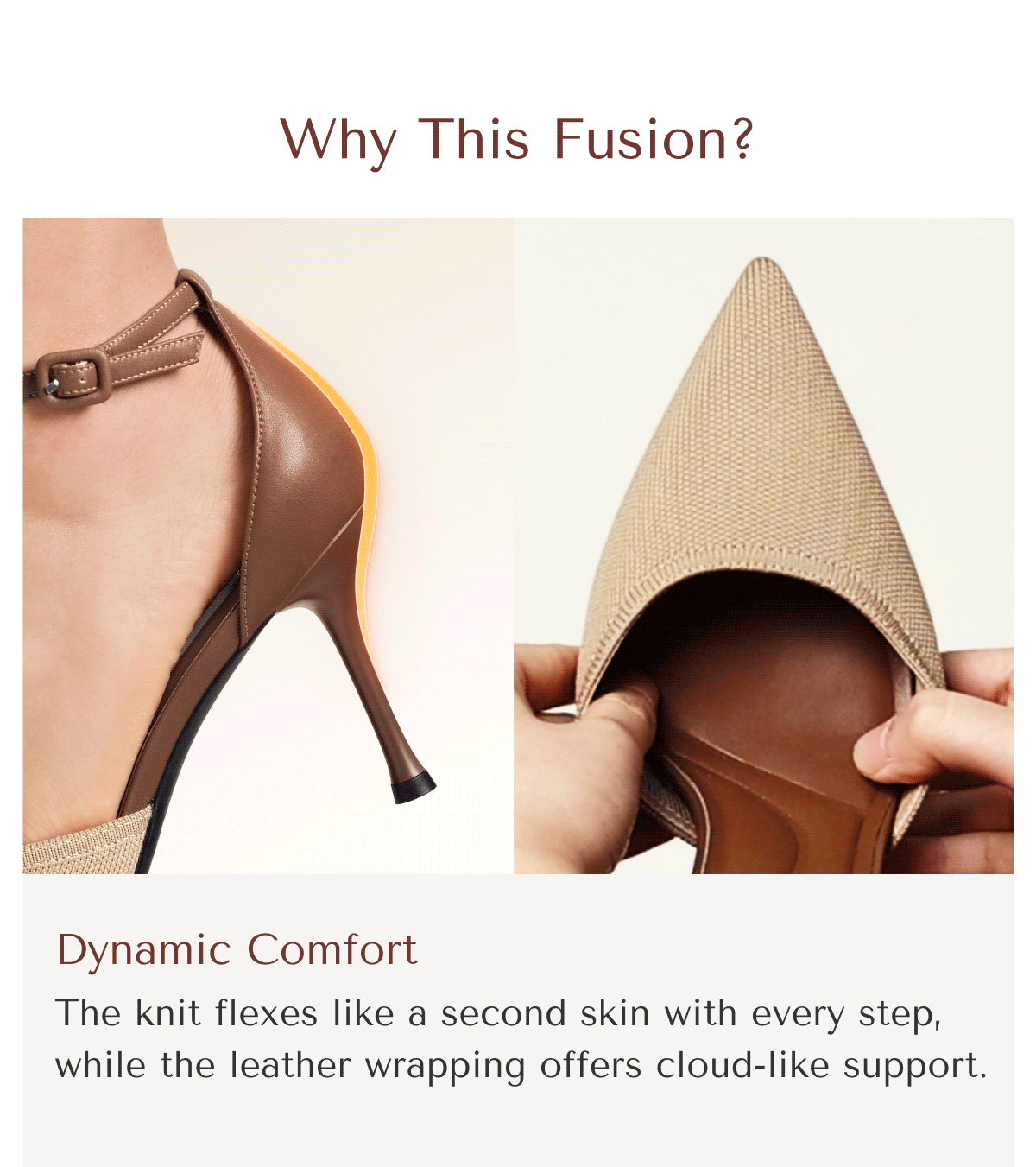 Crafted in a mix of fly-woven and PU, these pointed-toe pumps feature a dynamic two-tone design that wraps around the ankle with a refined pin-buckle strap. The color contrast creates visual elongation for the legs, while the breathable texture ensures lasting comfort.